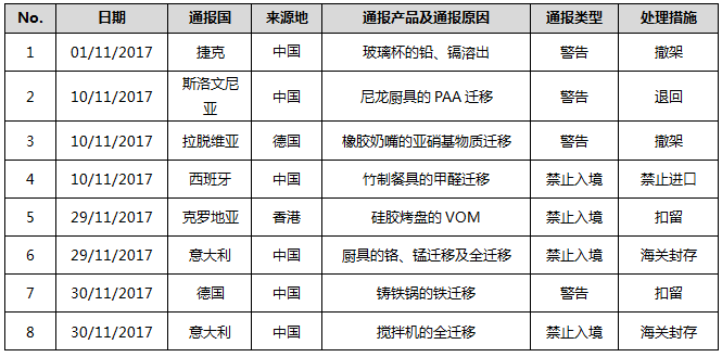 欧盟RASFF预警通报(FCM)篇--2017年11月