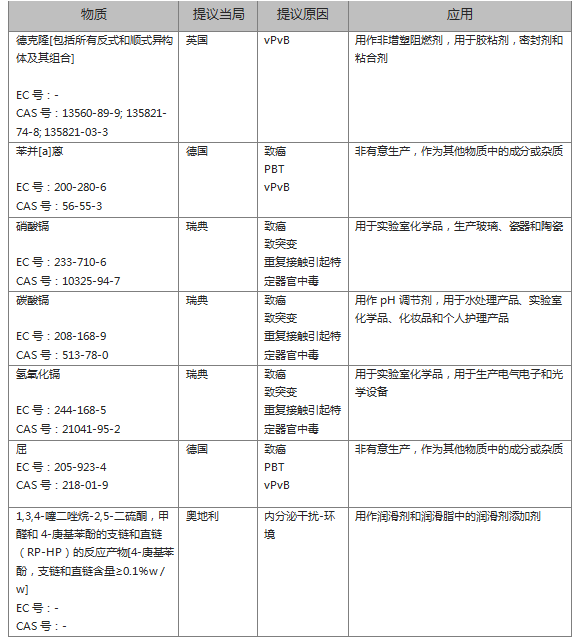 根据ECHA最新信息,欧盟成员国委员会一致同意将以下7种新物质加入SVHC候选物质清单,同时更新BPA属性。