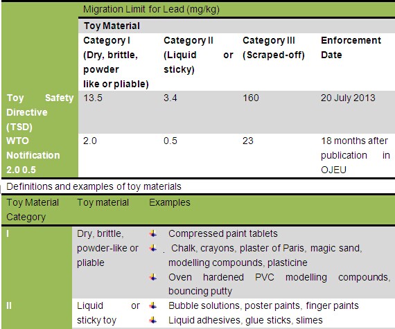 On 25 September 2014, the EU notified the WTO of a draft Commission Directive to amend the migration limits for lead in toys. If adopted, the enforcement date will be 18 months after publication in the OJEU.