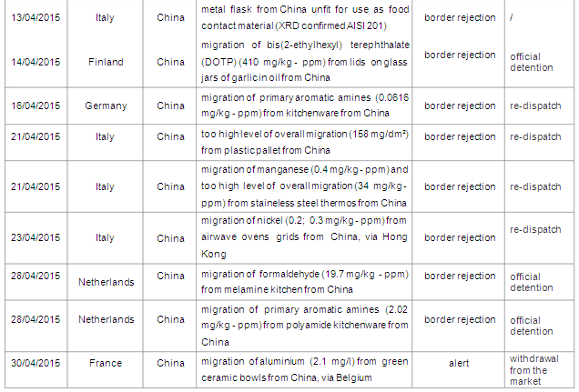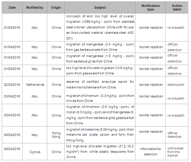 In April 2015, the Rapid Alert System for Food and Feed(RASFF) of EU have notified 22 cases of FCM (Food Contact Materials) products. 86%(19 cases) of FCM products notified are originated from China. STQ suggests manufacturers pay high attention on it. The products notified are mainly steel knives, plastic trays and barbecue sets, and the subject that notified are formaldehyde, heavy metal migration and overall migration.The details are as below: |
