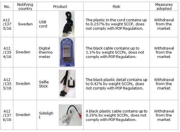 3) 4 products that contain too high SCCP, do not comply with the regulation on persistent organic pollutants (POP Regulation) were notified.