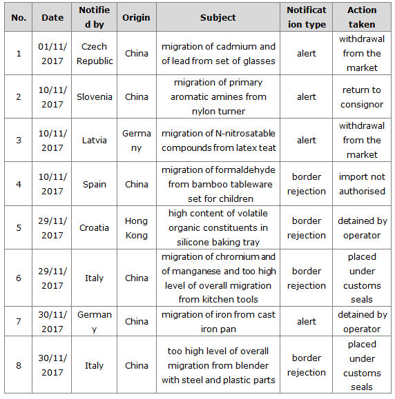 In November 2017, the Rapid Alert System for Food and Feed(RASFF) of EU have notified 8 cases of Food Contact Materials (FCM) products, 7 cases of which are originated from China. The details are as below: