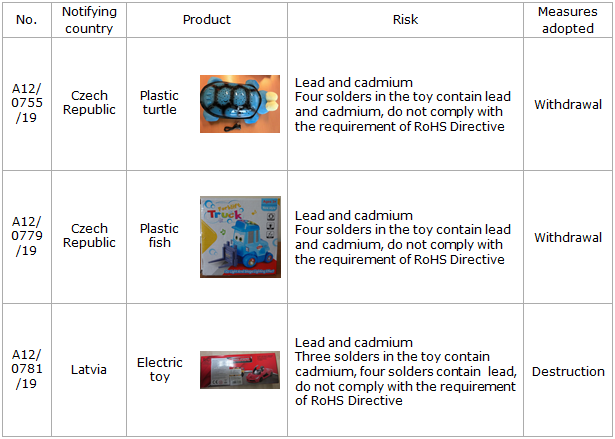 In May 2019, 172 cases of products were notified by EU RAPEX system, of which 93 cases (54%) were originated from China. Detail information about Chinese products notified are as below.