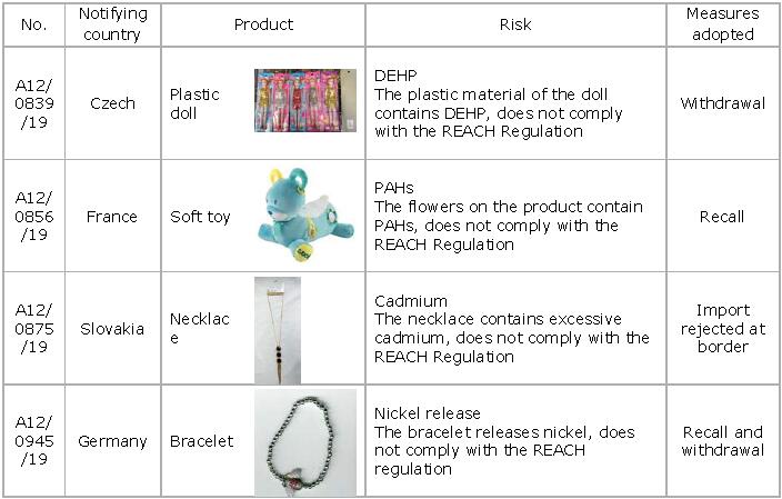 1) 12 cases of products that do not comply with the requirements of REACH were notified. Following are the detail information and part of examples.