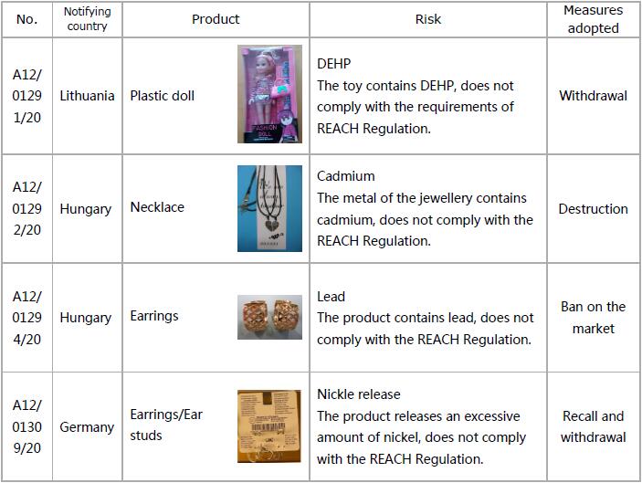 1) 16 cases of products that do not comply with the requirements of REACH were notified. Following are the detail information and part of examples.|