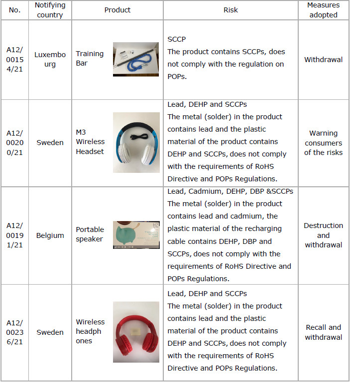 3) Four products that do not comply with regulation on persistent organic pollutants (POP Regulation) were notified, and three of these do not comply with requirements of RoHS 2. Following are the detail information.