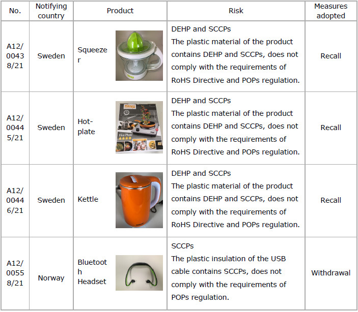 3) Four products that do not comply with regulation on persistent organic pollutants (POP Regulation) were notified, and three of these do not comply with requirements of RoHS 2. Following are the detail information.
