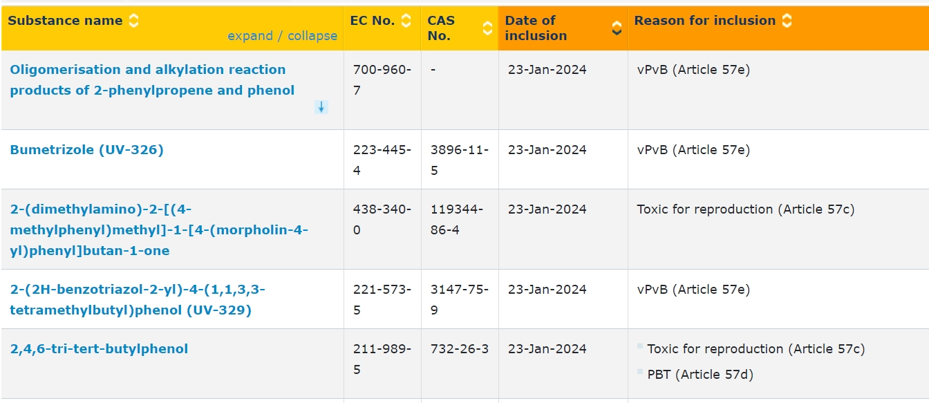 On January 23rd 2024, ECHA added 5 new substances to SVHC candidate list, which now contains 240 substances in total.The information of these new substances are as follow: