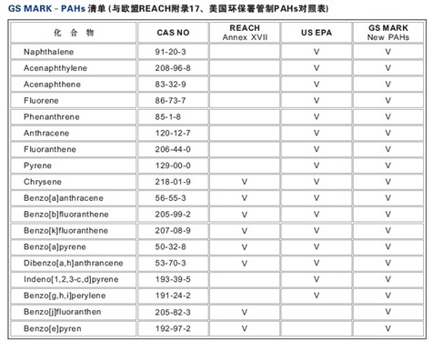 多环芳烃(PAHs)常存在于原油、木馏油、焦油、 染料、塑料、橡胶、润滑油、防锈油、脱膜剂、汽油阻凝剂、电容电解液、矿物油、柏油等石化产品中,还存在于农药、木炭、杀菌剂、蚊香等日常化学产品中。 到目前为止,各国家地区通过书面法律或法令确定禁用多环芳烃的有:欧盟76/769/EEC,REACH指令;德国German:GS认证、LFGB;美国US:EPA;中国:GB,GB/T,GHZ 德国安全技术认证中心(ZLS)经验交流办公室(Central Experience Exchange Office, ZEK)AtAV委员会2007年11月20日通过诀议(参见ZLS官方网站上公告第 ZEK 01-08号文件),要求在GS标志认证中强制加入PAHs测试。该规定已于2008年4月1生效 ,生效之日起不能通过PAHs测试的产品将无法获得GS认证标志而顺利进入德国。 2011年11月29日,德国GS认证技术文件ZEK 01.4-08发布,更新对多环芳烃(PAHs)的测试要求。ZEK 01.4-08将GS认证测试PAHs的种类由原先的16种扩大为18种,增加的两项物质为苯并[j]荧蒽和苯并[e]芘。根据该文件要求,从2012年7月1日起进行GS认证的产品必须测试18种多环芳烃(PAHs)。