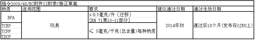 2013年7月,EC向WTO发布两份通报,增加TSD管制的玩具中限用物质的数量。其中,一份通报引用了双酚A的迁移限值,另一份通报则引用磷酸三(2-氯乙基)酯(TCEP),磷酸三(2-氯丙基)酯(TCPP)和磷酸三(1,3-二氯异丙基)酯(TDCP)的特殊限值。 法规(EU) 1272/2008(物质和混合物分类、标签和包装法规)(CLP)将双酚A归类为二类再生有毒物质,但无具体浓度限值规定。BPA是制造聚碳酸酯塑料的基础材料,而聚碳酸酯塑料则用于制造玩具和其他消费产品,除此之外,儿童书刊的塑料材料中曾检出含有双酚A。 TCEP被用于聚合物中的阻燃增塑剂,玩具中可能含有TCEP,只是浓度低于CLP法规规定的浓度限值。对于TCPP和TDCP进行的风险评估表明,如果制造玩具时使用TCPP和TDCP,则关于TCEP的考虑同样适用。 相关方可在通知发布之日起60天内,向欧洲委员会提出提案评论。 具体信息如下: