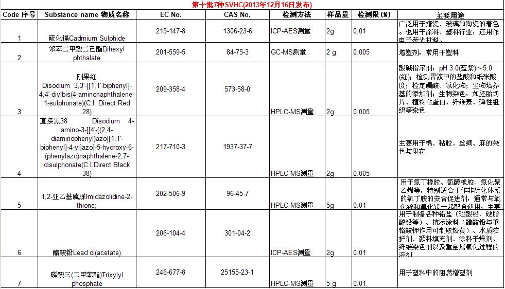 ECHA于213.12.16日正式公布第十批高关注度物质SVHCs,此次加入的SVHC共有7种,至目前为止,SVHC物质共有151项,此次加入的7种物质具体信息如下: