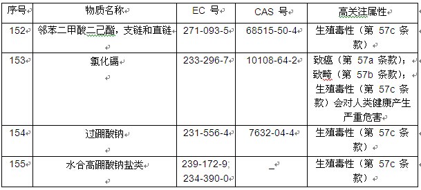 2014年06月16日,ECHA将4个新的高关注度物质加入候选物质清单,目前候选清单共有155种物质,新增的4种物质详细信息如下: