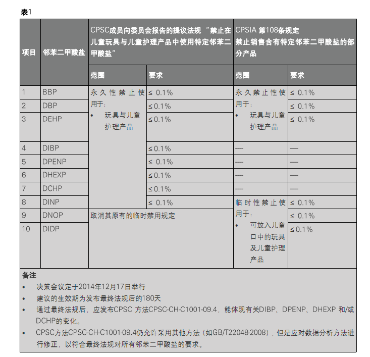 | 2008年8月,美国总统乔治·布什将《2008年消费品安全改进法》(CPSIA)签署成为法律。该法第108条规定,永久性禁止在玩具和儿童护理产品中使用BBP、DBP和DEHP,临时性禁止在可放入儿童口中的玩具及儿童护理产品中使用DINP、DNOP和DIDP。 2014年11月25日,委员会收到一份关于提议法规“禁止在儿童玩具与儿童护理产品中使用特定邻苯二甲酸盐”的报告,为草拟禁止在儿童玩具与儿童护理产品中使用特定邻苯二甲酸盐的法规提供参考。此次报告中提交的草案法规并非最终的提议法规。报告旨在通知CPSC委员会成员筹备于2014年12月17日召开的最终提议法规的决策会议。委员会有望在此次会议上制定出最终的提议法规。 报告还建议委员会发布一则有关提议法规的公告,该提议法规能符合CHAP的大部分建议,包括: ·应永久性禁止BBP、DBP、DEHP、DIBP、DPENP、DHEXP(DnHP)和DCHP ·应永久性禁止已被临时禁止的DINP ·应取消禁止已被临时性禁止的DIDP和DNOP 此外,CHAP报告还建议临时性禁止DIOP。报告称“CPSC成员建议在没有足够数据可以确定是否需要采用永久性法规之前,应不采取任何管制行动。而且,CPSIA第108条并未对委员会制定的临时禁止/限制做出任何规定。如委员会选择临时限制,就需要根据《联邦有害物质管理法》(FHSA)另行制定法规。” 该报告还要求发布CPSC方法CPSC-CH-C1001-09.4取代CPSC-CH-C1001-09.3(2010年4月1日发布的测定邻苯二甲酸盐含量的标准操作程序),新方法包括了最终法规中新增的邻苯二甲酸盐。 表1概述了CPSC成员的建议要点及其与CPSIA现有要求的对比。