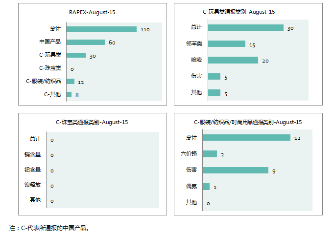 | 2015年8月份,欧盟RAPEX共通报110例产品,其中中国产品60例,占总通报数的55%。