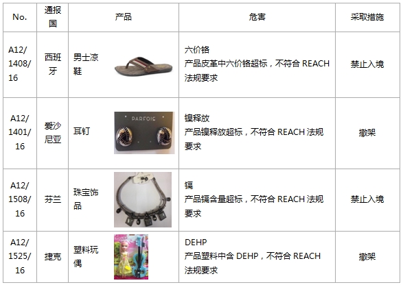 二、通报情况详解 1.本月共通报11例违反REACH法规的产品,其中8例玩具及儿童产品邻苯二甲酸酯超标,1例珠宝饰品镉超标,1例珠宝饰品镍释放超标。另有1例六价铬超标产品。部分示例如下: