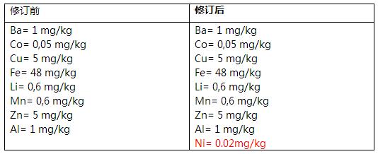 2017年4月29日,欧盟官方公报发布新法规 (EU) 2017/752,修订FCM塑料法规 (EU) No 10/2011。修订法规新增元素镍至附录II-限制物质中,其迁移限值为0.02mg/kg食物模拟液。修订后附录II中限制重金属如下: