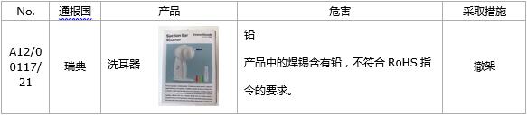 3.本月无违反POPs法规的产品被通报。 4.本月仅有1例违反RoHS法规的产品被通报,示例如下:
