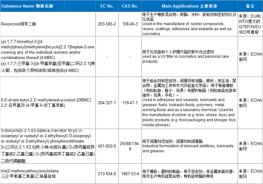 2021年9月3日,欧洲化学品管理局(ECHA)发布了一份新的高关注物质(SVHC)咨询清单,就4种SVHC意向物质展开公众咨询。咨询截止日期为2021年10月18日。此外早先欧盟向WTO提交了G/TBT/N/EU/803号通报,重新对间苯二酚进行评议。5种物质的详细信息见下表。