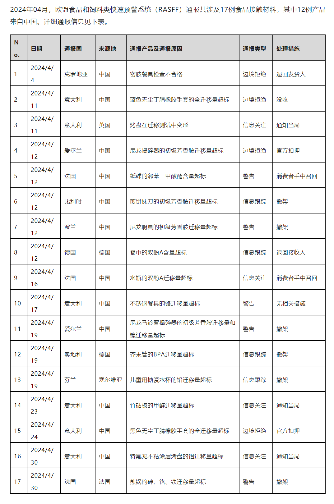 欧盟RASFF预警通报(FCM)篇--2024年4月