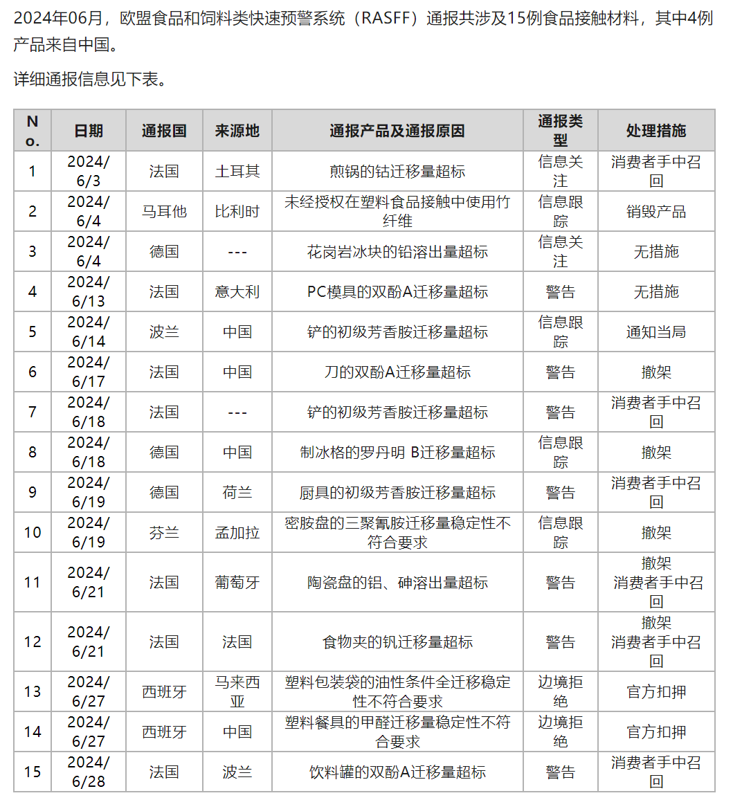 欧盟RASFF预警通报(FCM)篇--2024年6月