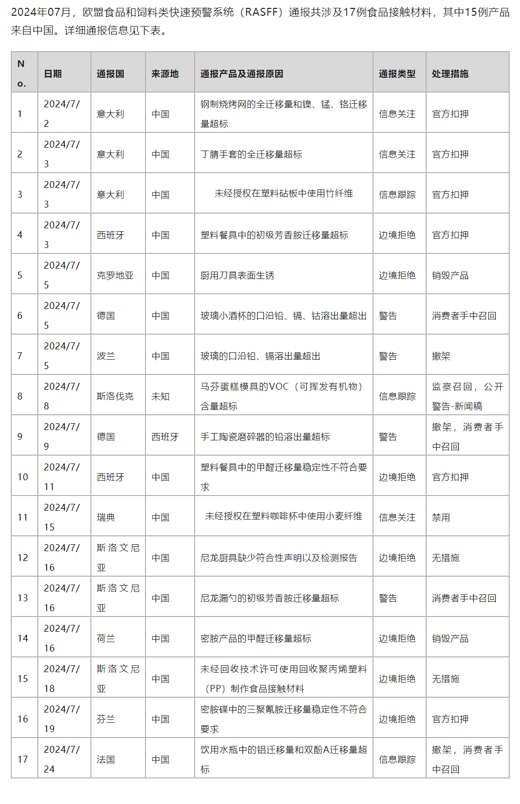 欧盟RASFF预警通报(FCM)篇--2024年7月