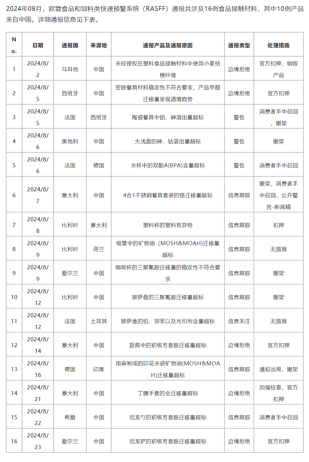 欧盟RASFF预警通报(FCM)篇--2024年8月