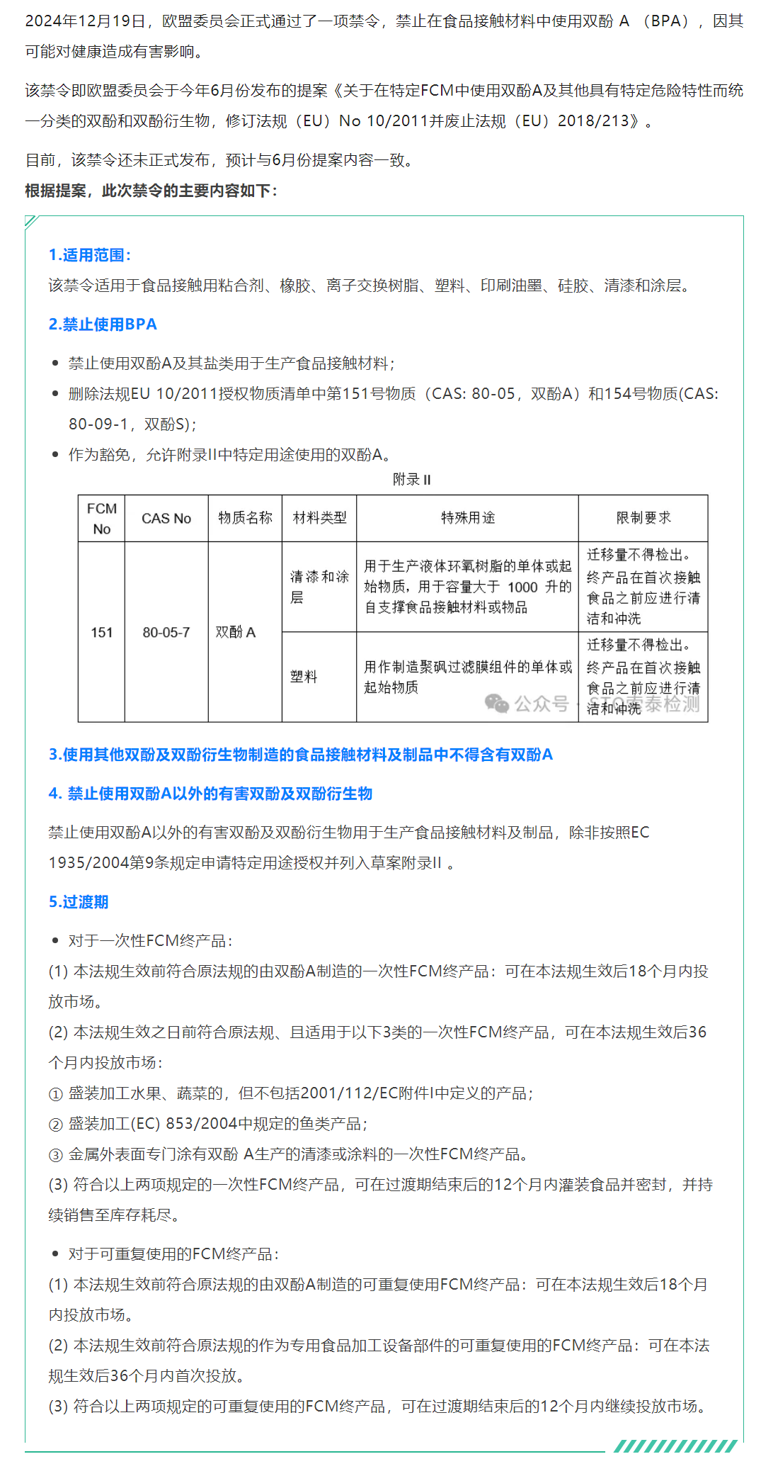 欧盟委员会正式通过食品接触材料中双酚A禁令